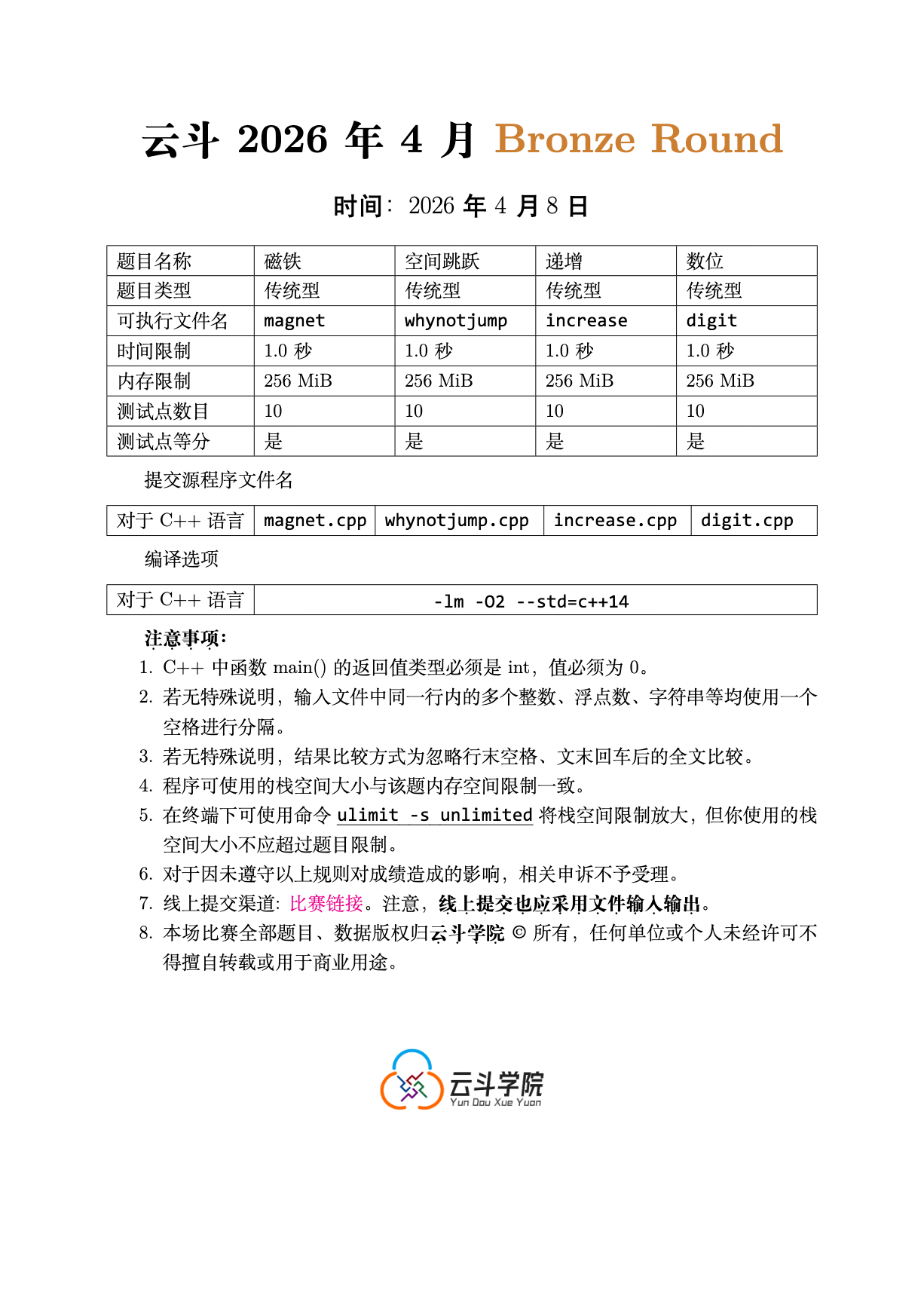 参考比赛 pdf 文件。即本公告下方的云斗四月BronzeRound.pdf。